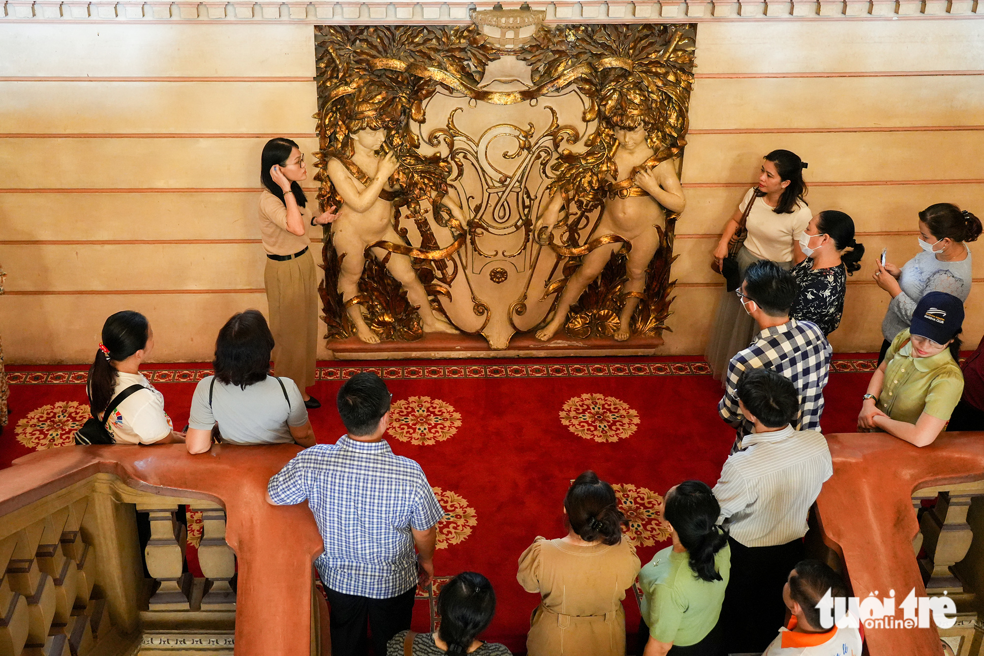 Sáng 22-4, trụ sở HĐND và UBND TP.HCM mở cửa đón đoàn khách đầu tiên dịp lễ 30-4 năm nay. Đoàn tham quan một bức phù điêu ngay chính diện cầu thang lên tầng một – Ảnh: HỮU HẠNH